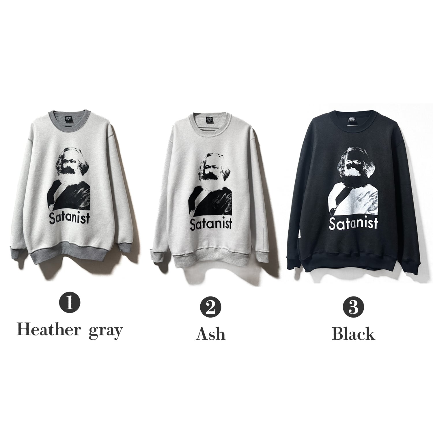 フロントグラフィックは カール・マルクスの肖像とその下に SATANIST のタイポグラフィを配置。