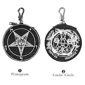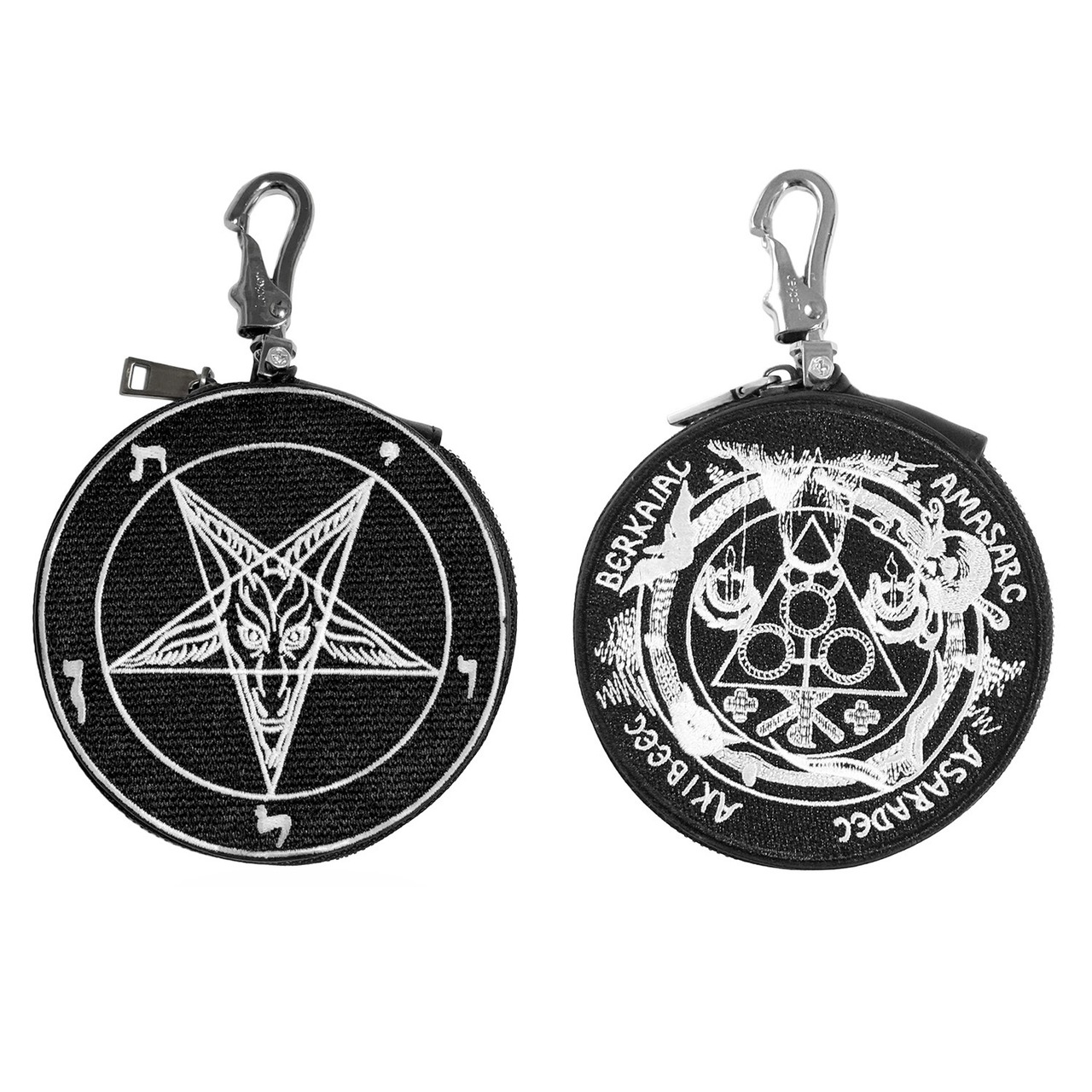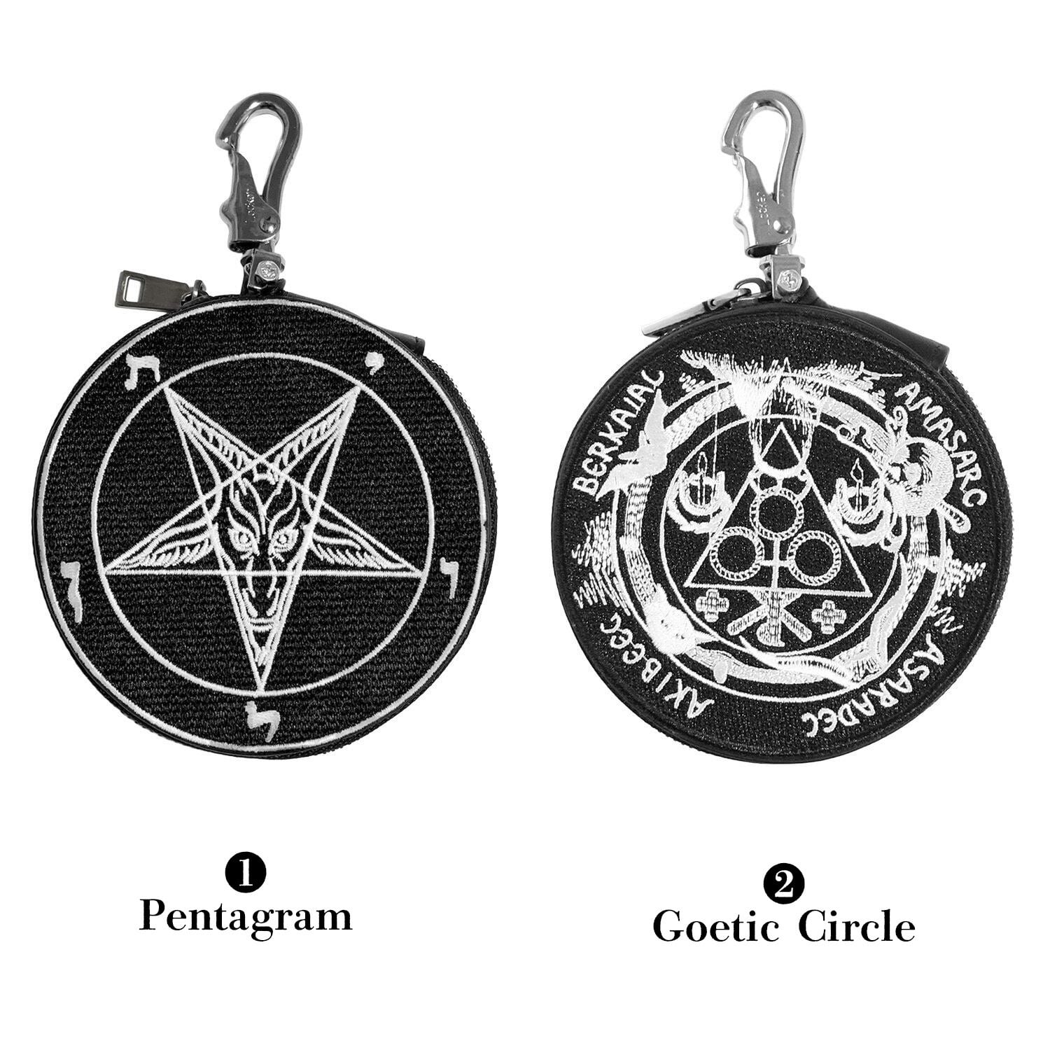 バフォメット、ゲーティアのオカルティックな魔法円の刺繍が施されたレザーサークルポーチ。